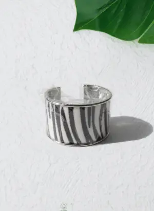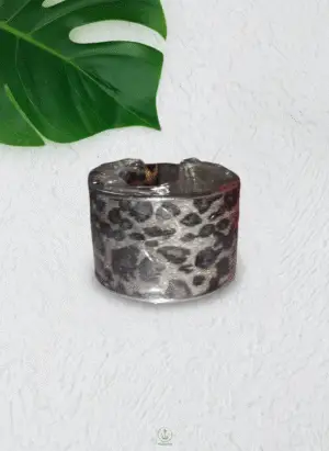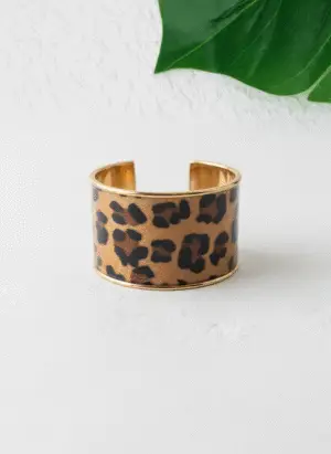 سوار عريض بتصميم جريء، يتميز بغطاء من الفرو أو القماش بنقشة جلد النمر، محاط بحواف معدنية لامعة من الذهب أو النحاس.