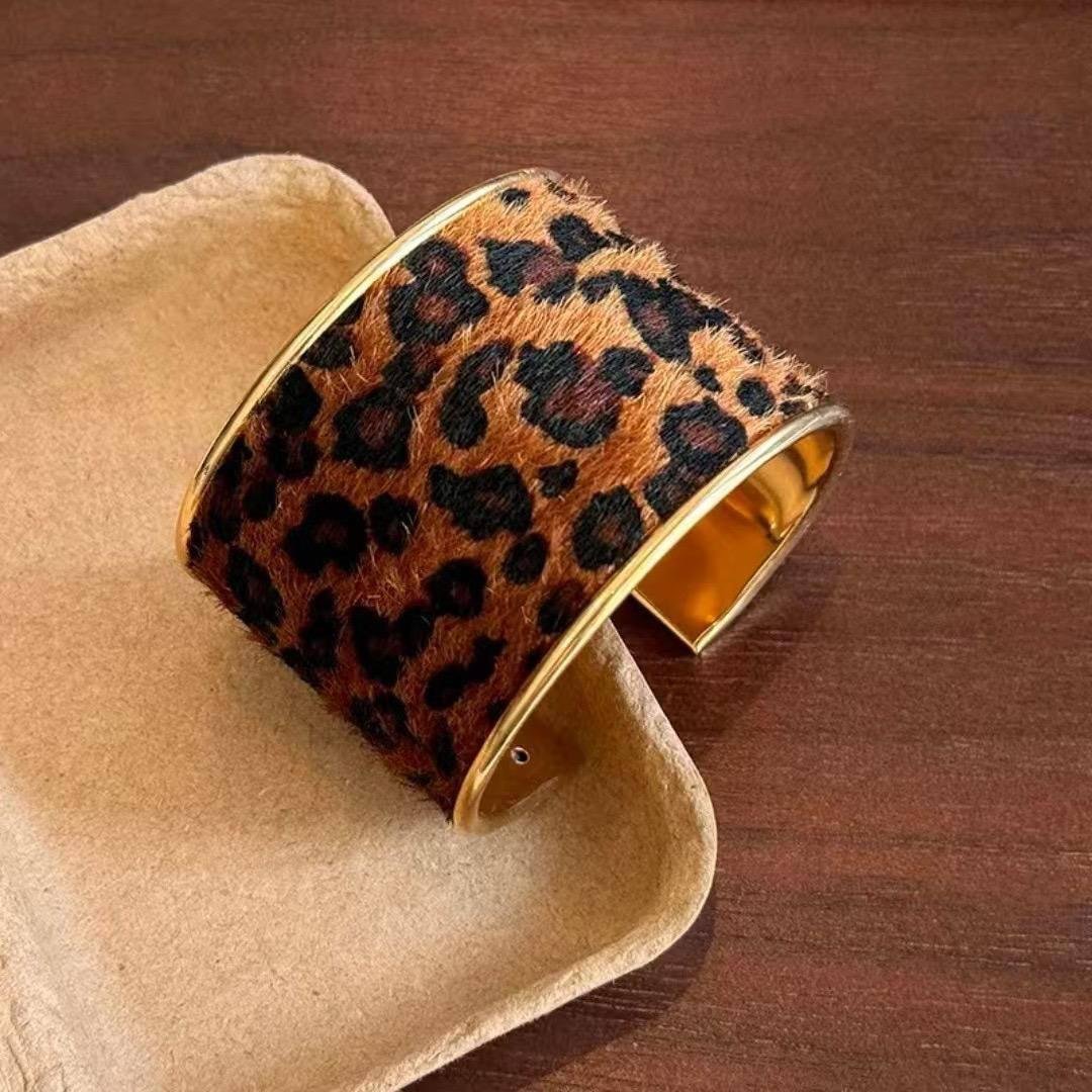سوار عريض ذو تصميم جريء، مع تغطية بنقشة الفهد من الفراء أو القماش