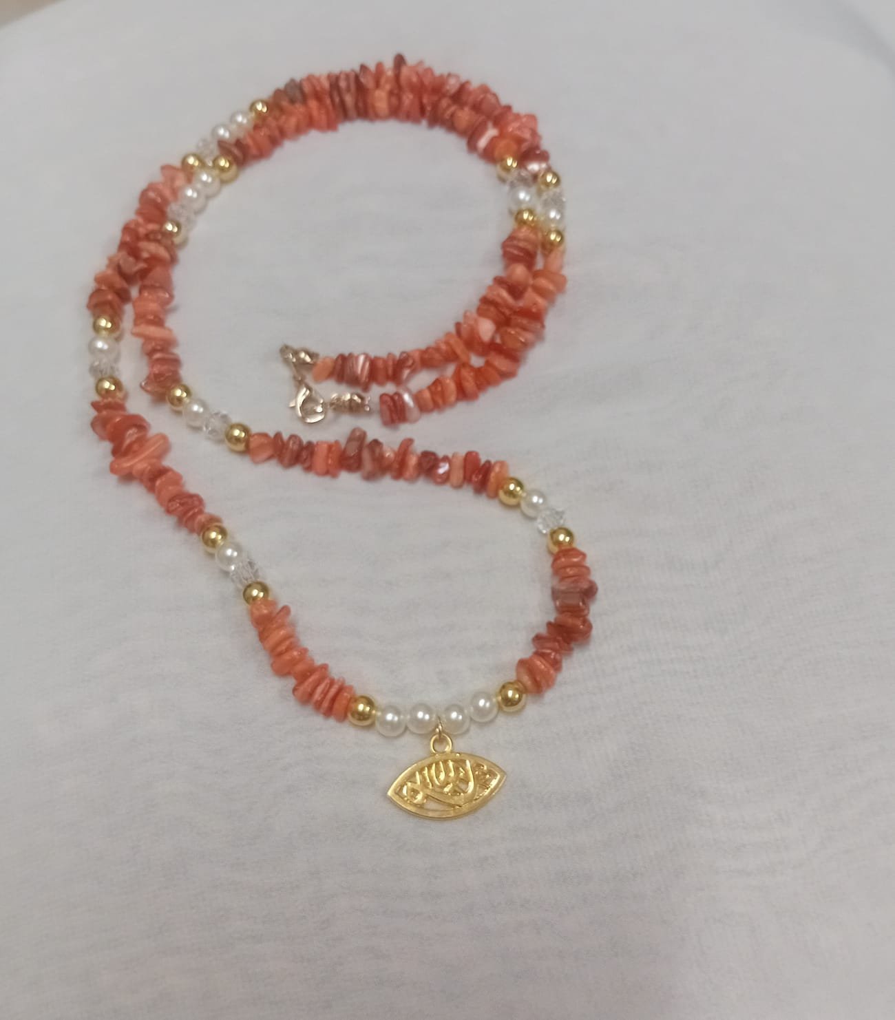 - “عقد قصير (تشوكر) ذو صفين من الخرز بتصميم ناعم. الصفان مصنوعان بشكل رئيسي من خرز المرجان البرتقالي/الخوخي الخام غير المنتظم. يتخلل المرجان خرزات لؤلؤ أبيض وخرزات كروية ذهبية لامعة وخرزات كريستال شفاف مقطوع. يتميز العقد بقلادة على شكل عين بلون ذهبي منقوش عليها عبارة “يا رب” بخط عربي. مزود بقفل لوبستر ذهبي.”
