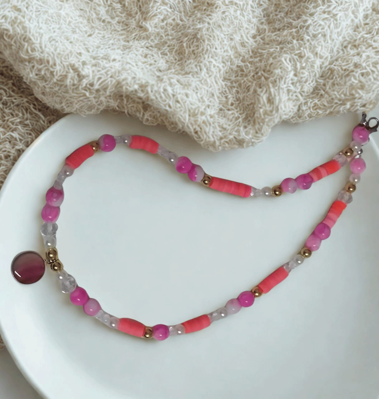 عقد يدوي الصنع يجسد تناغم الألوان الوردية والبنفسجية بأسلوب بوهيمي أنيق