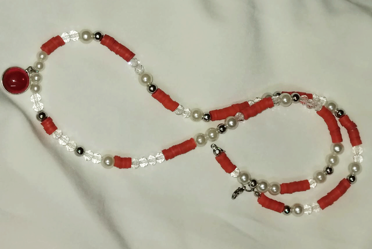 تتدلى قلادة صغيرة دائرية ذات حافة معدنية فضية لامعة، بداخلها حجر أو راتنج بلون
