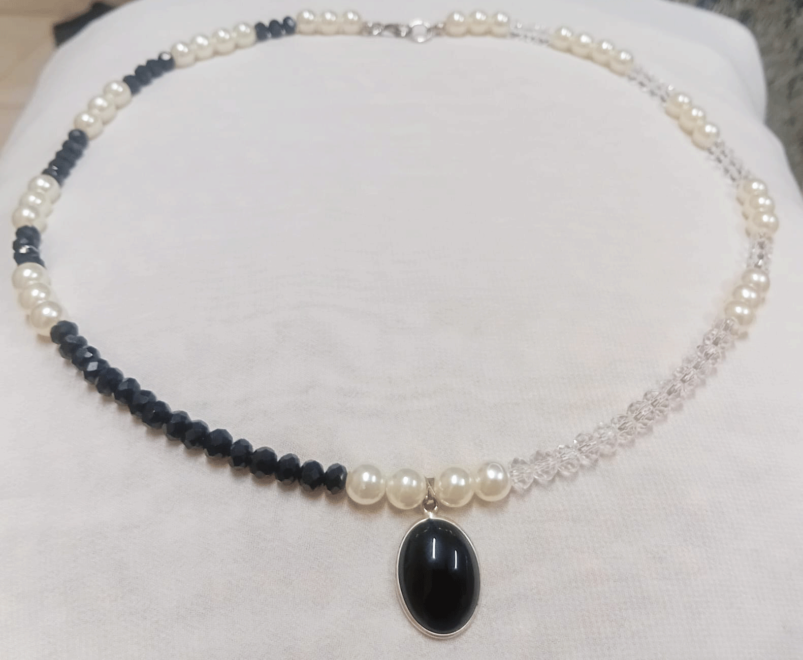 عقد مصنوع يدوياً من خرز اللؤلؤ الصناعي، خرز كريستال أسود وجهد، وخرز كريستال شفاف (كوارتز). يتميز بدلاية أسود بيضاوية في إطار فضي. طول متوسط وقفل كلاسيكي