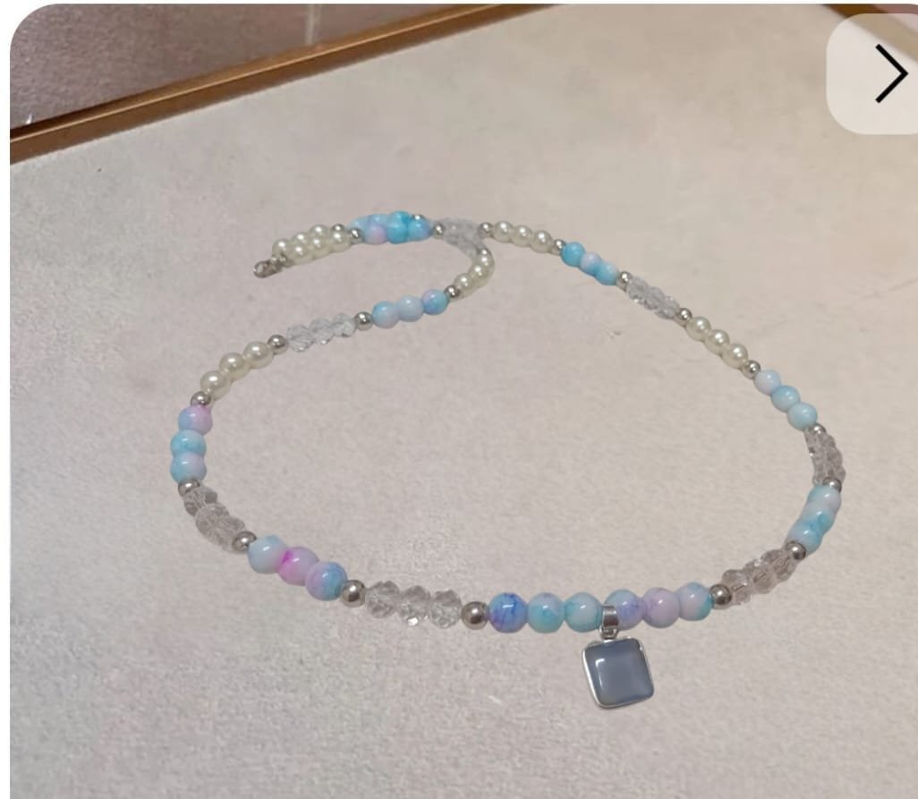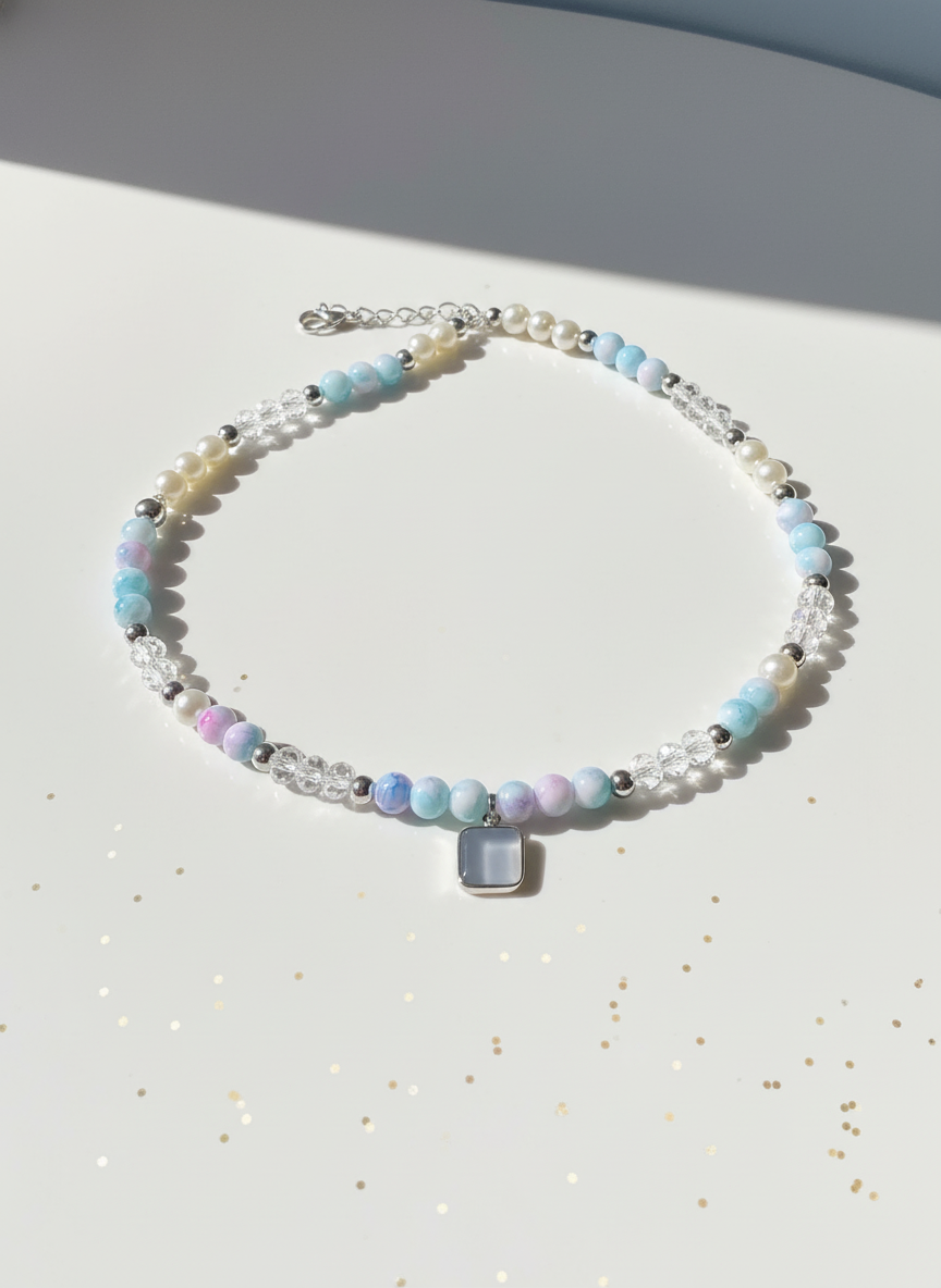عقد قصير (تشوكر) بتصميم دائري، يجمع بين الألوان الهادئة والعناصر اللامعة، مما يمنحه مظهرًا رقيقًا وأنثويًا.