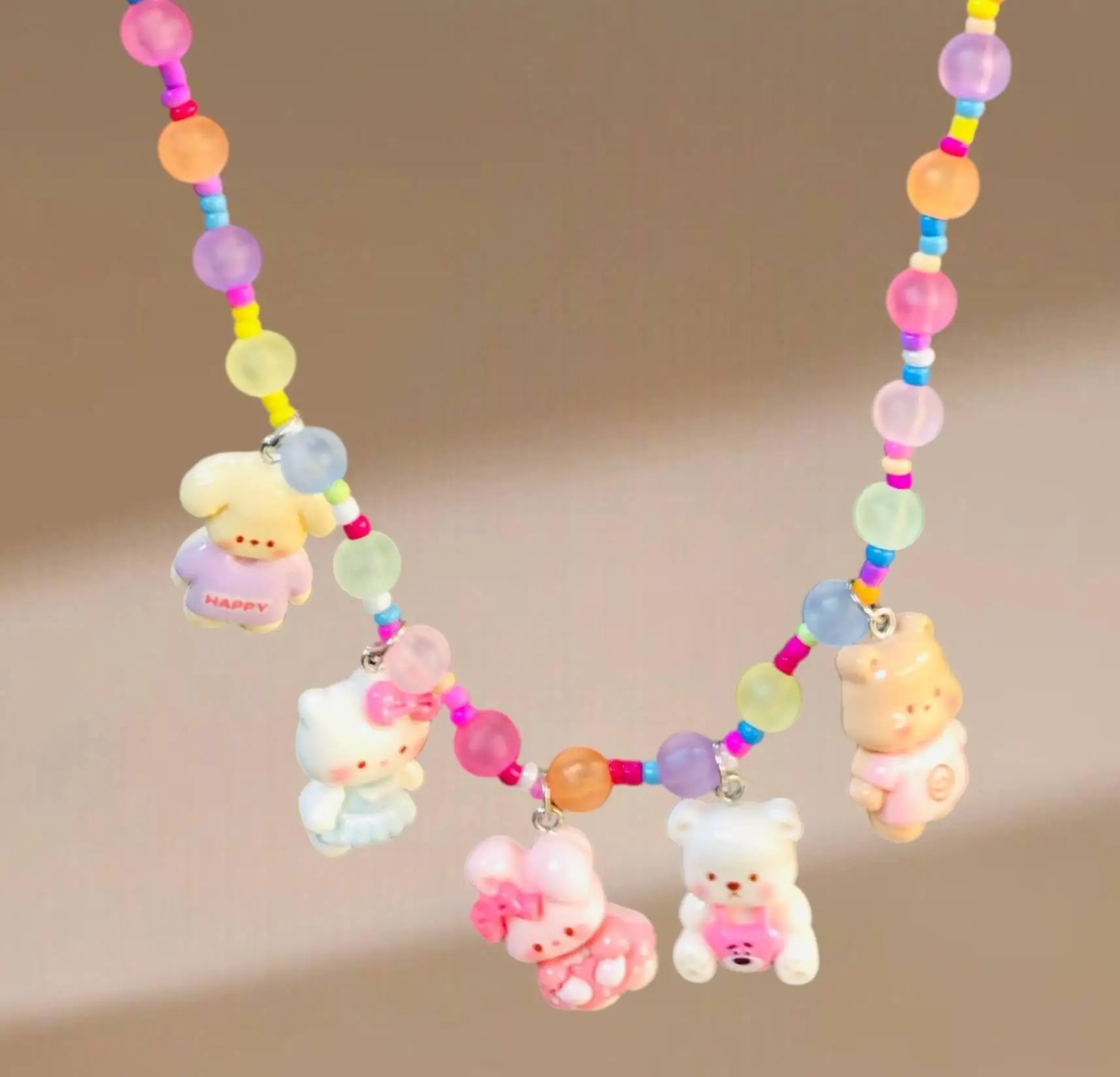 قلادة يدوية الصنع مبهجة ونابضة بالحياة، تتميز بمزيج من خرز الحلوى الملون والشفاف. وهي مزينة بخمسة تعليقات كرتونية رائعة (دببة وأرانب) بألوان باستيل ناعمة.