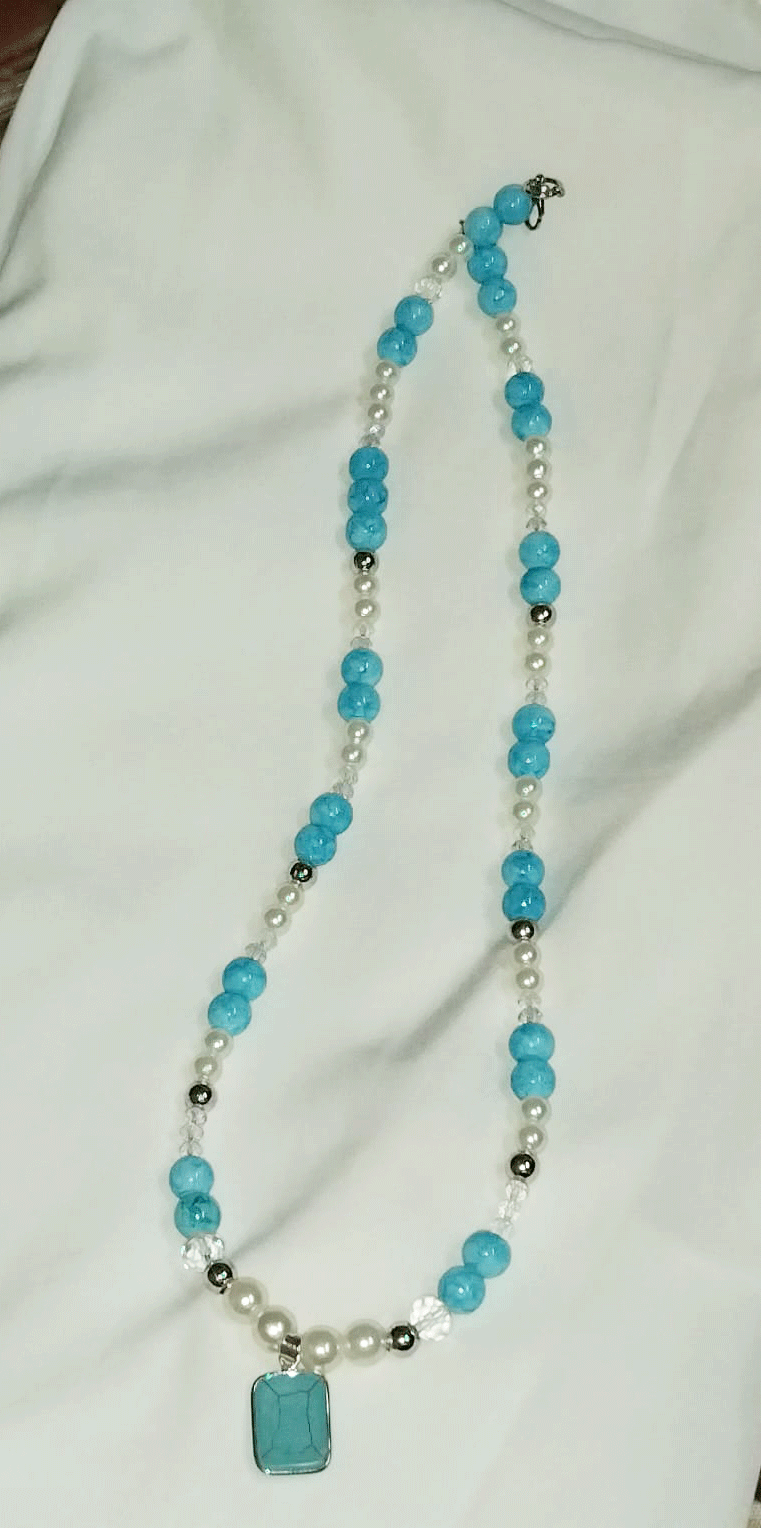 تجمع بين خرز أزرق فيروزي وخرز لؤلؤي أبيض وخرز فضي، مع فواصل شفافة صغيرة.